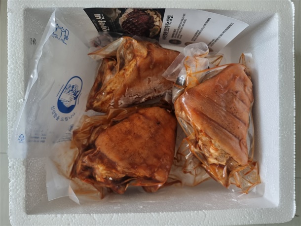 품목보고번호: 20160502016150/ 보관방법:냉동보관 포장재질:내포장(폴리에틸렌),외포장(스치로폴,랩)/ 유통기한:별도표시 원재료명:돼지다리91%(외국산(캐나다,독일,스페인외), 일차양념5% {간장[정제수,탈지대두(인도산),양조간장{탈지대두(인도산),천일염(호주산),소맥(밀)),양 파(국내산),마늘(국내산),복함향신료0.S2.7%[함수결정포도당(옥수수전분 100%)혼합유장분(유장분말95%(국산93%,외국산 칠레,필란드,미국등 7%), 덱스트린