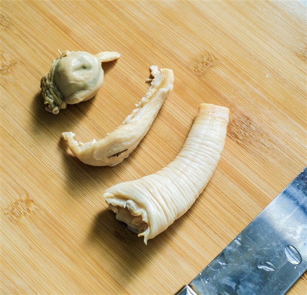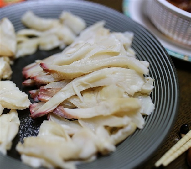 4. 내장 따로 끓이는 동안 코(수관)을 찬물에 넣고 쌓여있는 검은 껍데기를 제거한 후 1분간 데쳐줍니다.